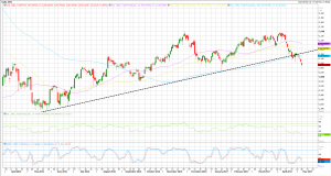 Shanghai Composite Index managed to break its uptrend line, which lasted since Q1 of last year, declining all the way to as low as 3,078 at the close, which deepens the downside outlook over the coming days, with a possibility to retest the 3,000 psychological support.
