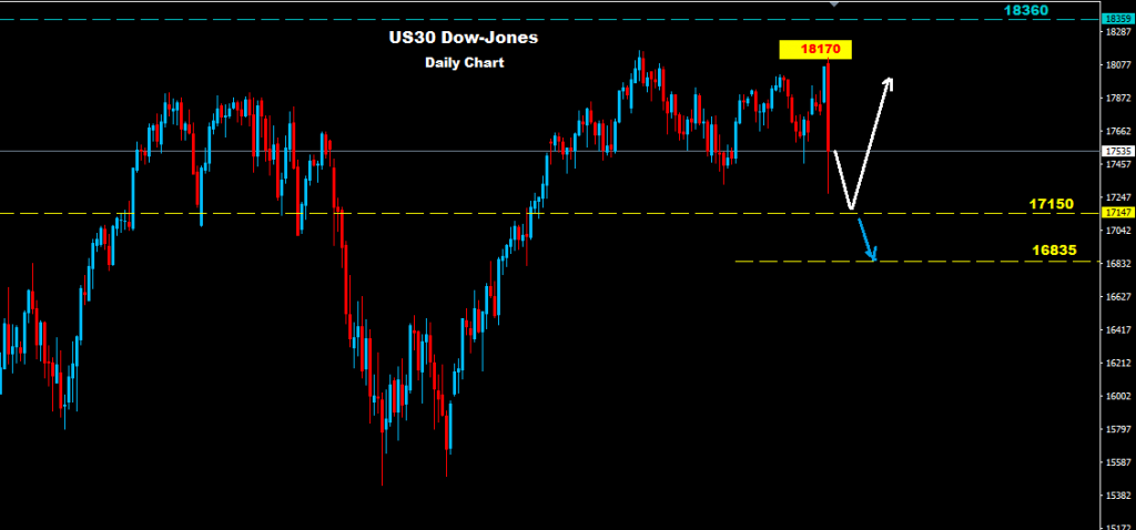اي اغلاق يومي تحت مستويات 17150 قد يضع مزيد من ضغوط الهبوط على الداو للتوجه لاختبار مستويات 16835