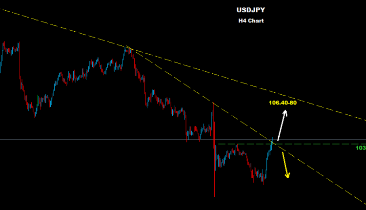 نجح السوق بتجاوز مستويات 103.60 حيث نصحنا سابقا انه وفوق هذه المستويات فان مزيد من الارتفاع سيكون متاحا باتجاه اسعار 105.50 وربما 80-106.40