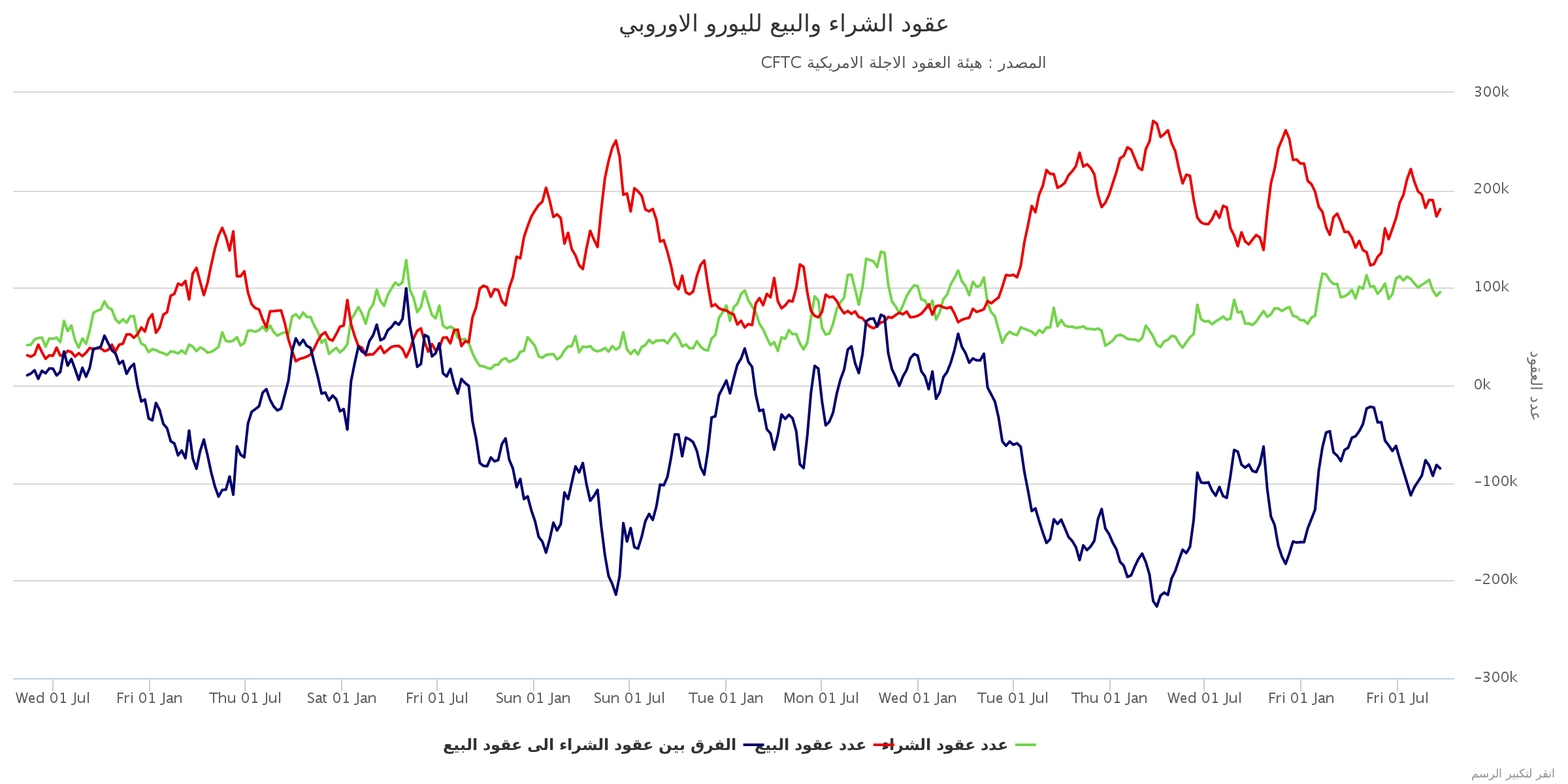 لننظر اولاً الى توقعات المتداولين والمستثمرين في الاسواق تجاه اليورو, وهذا الشيء من الممكن ان نعرفه من خلال تقرير التزامات المتاجرين والذي يتم اصداره بشكل اسبوعي من هيئة العقود الاجلة الامريكية. تقرير COT هو تقرير مفصل يتم إصداره من هيئة تداول العقود الآجلة الأمريكية, حيث أن هذا التقرير يوضح العقود التي بحيازة المتداولين سواء عقود بيع أو عقود شراء في معظم اسواق العقود الآجلة, حيث أن هذه التقارير تتضمن أسواق العملات, الأسهم, المعادن, السلع,,,,, الخ والموجودة خصوصا في الولايات المتحدة الأمريكية في ولاية نيويورك وشيكاغو. حيث تقوم هيئة تداول السلع والعقود الآجلة الأمريكية بإصدار التقرير كل يوم جمعة في تمام الساعة 3:30 بالتوقيت الشرقي, ويوضح بالتفصيل العقود التي يقوم بها المتداولين قبل يوم الثلاثاء الذي يسبق التقرير.في الرسم البياني ادناه هناك ثلاث مؤشرات, المؤشر الاحمر الذي يوضح عدد عقود البيع, والمؤشر الاخضر يوضع عقود الشراء, والموشر الازرق الداكن يوضح الفرق ما بين عقود الشراء الى عقود البيع.