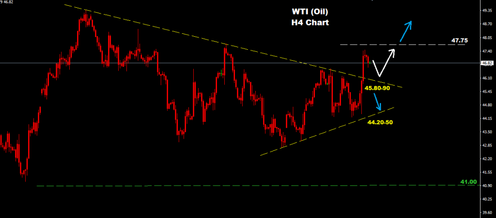 مع تلميحات المملكة السعودية لانهاء سياسة العبث بالاسعار فان النفط الخام تمكن من اختراق مستويات المقاومة للترند الهابط حيث يواجه الان مستويات مقاومة على اسعار 47.75