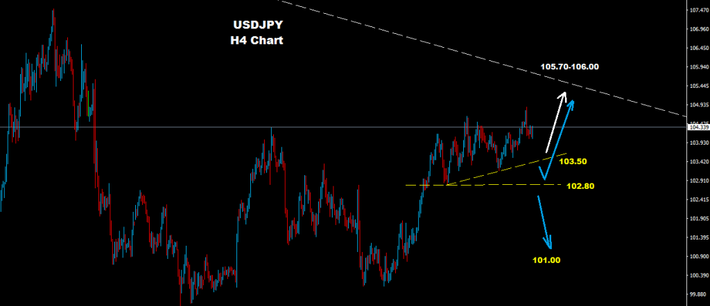 يواجه السوق منطقة دعم على اسعار 103.50 و 102.80 حيث طالما يحافظ على تداولاته فوق احد تلك الحواجز فان الموجه الصاعده ستستمر نحو مناطق 105.70