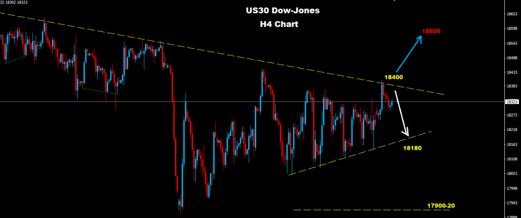 طالما السوق مستمر بالتداول تحت مستويات 18400 فان تراجع اخر سيكون متوقع نحو مستويات 18180 ضمن منطقة التداول هذه