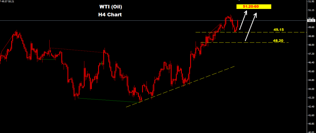 يواجه السوق منطقتي دعم محتكلة الاولى على اسعار 49.15 و الثانية على اسعار 48.20 حيث و طالما اسعار النفط مستقره فوق احد تلك المستويات فان الاهداف ستستمر نحو مناطق 60-51.20