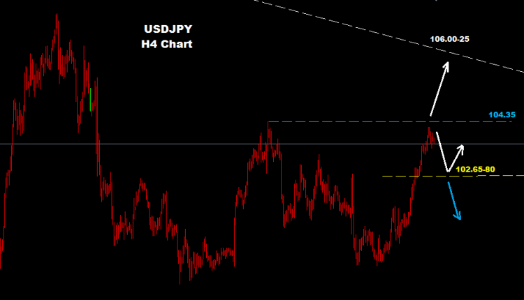 فوق مستويات 104.35 فان السوق قد يتجه لموجه صاعده جديده نحو الاهداف النهائيه لمناطق 25-106.00