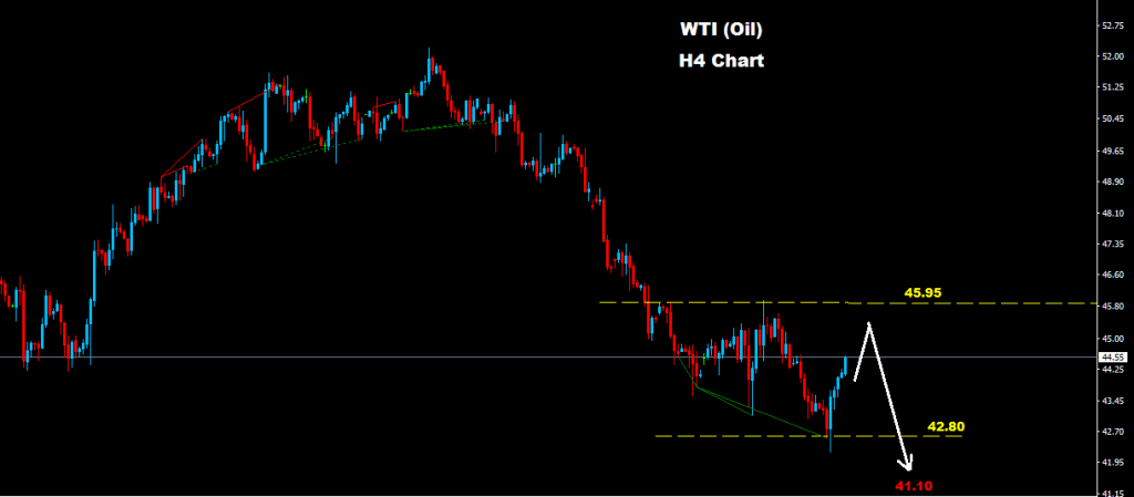 حتى الان فان النفط الخام يظهر استمرار الارتداد التصحيحي حيث سيواجه منطقة مقاومة على مناطق 95-45.65 و التي قد تدفع بموجه هابطة جديدة باتجاه مستويات 41.10