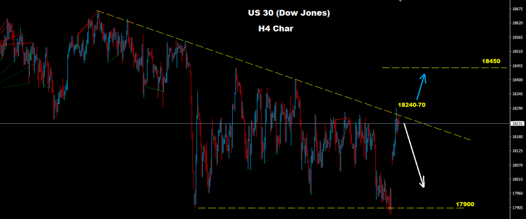 نجح مؤشر الداو بالتقدم و الارتفاع فوق مستويات 18150 فيما نجح باعادة اختبار مناطق المقاومة 70-18240 مع ضربه لاسعار فوق هذه المستويات قبل العودة للتداول تحت حواجز الترند الهابط كما نرى على الرسم البياني
