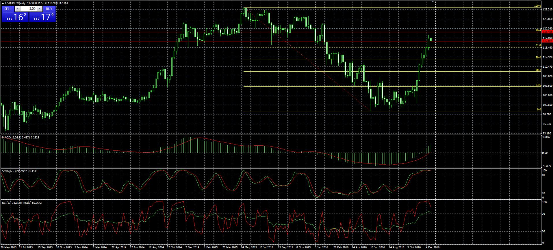 انخفض الين الياباني خلال فترة 6 اسابيع على التوالي امام الدولار وهو الشيء الذي لم نشهد له مثيل منذ العام 2014 تقريباً. الدولار مقابل الين ارتفع الى ما فوق مستويات 117 ليصل الى ما فوق مستويات التصحيح بواقع 50% و 61.8% لفيبوناتشي على المدى الطويل, وهو ما يعتبر احد اهم المستويات التي ادت الى المزيد من الارتفاعات والتي وصلت الى المستويات التي عليها الدولار مقابل الين اليوم. في الوقت الحالي, الدولار مقابل الين يتداول قرب مستويات مقاومة مهمة تتمركز عند 119.40, والتي تمثل مستويات 76.4% (تصحيح) فيبوناتشي أيضاً, والتي تعتبر اخر مستويات للزوج لوقف الارتفاعات المستمرة في الزوج. عدا عن ذلك, فمن الممكن ان تتغير النظرة العامة الى الايجابية للدولار مقابل الين بدلاً من النظرة السلبية المتواجدة حالياً على المدى المتوسط والطويل. وعليه, وفي ما لو تم ذلك, فمن الممكن ان نشهد ارتفاعات للدولار مقابل الين الى ما فوق مستويات 120.0 خلال الفترة المقبلة.