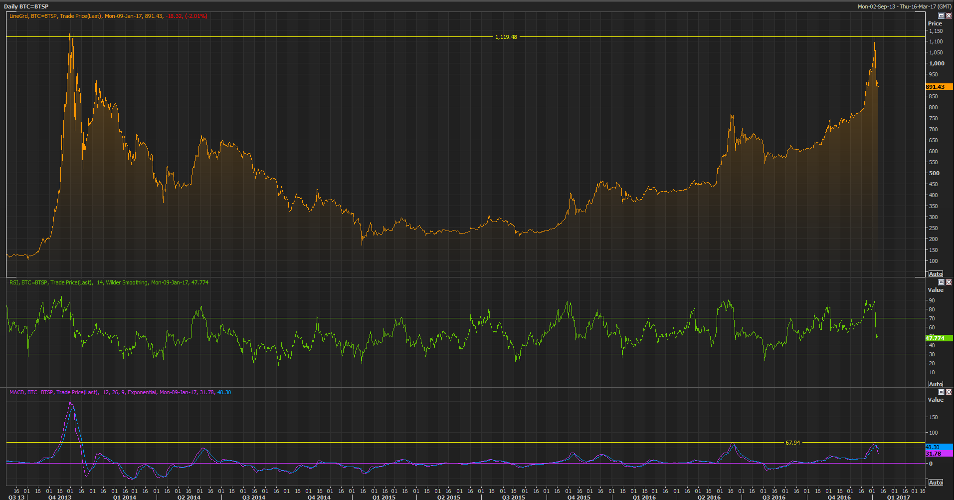 على الرغم من هذا, إلا انه وبالنظر الى الرسم التقني للعملة الافتراضية في ذلك الوقت, وعندما وصلت الى مستويات تاريخية يوم 30 نوفمبر من العام 2013, كان هناك تقاطع واضح لمؤشر MACD ومؤشر القوة النسبية RSI على المستوى اليومي, وهو ما يعرف بأنه اشارة سلبية جديدة على المدى القصير على الاقل, وهو بالفعل ما حصل, وشهدت العملة عمليات بيع كبيرة في ذلك الوقت وادت الى الانخفاض بشكل كبير, هذا فضلاً عن التحذيرات المتككرة من قبل السلطات الصينية, بالاضافة الى الاجراءات التي اتخذها البنك المركزي الصيني بعد خمس ايام تقريباَ من بداية انهيار العملة, وهو ما سرع الانخفاض بشكل حاد.