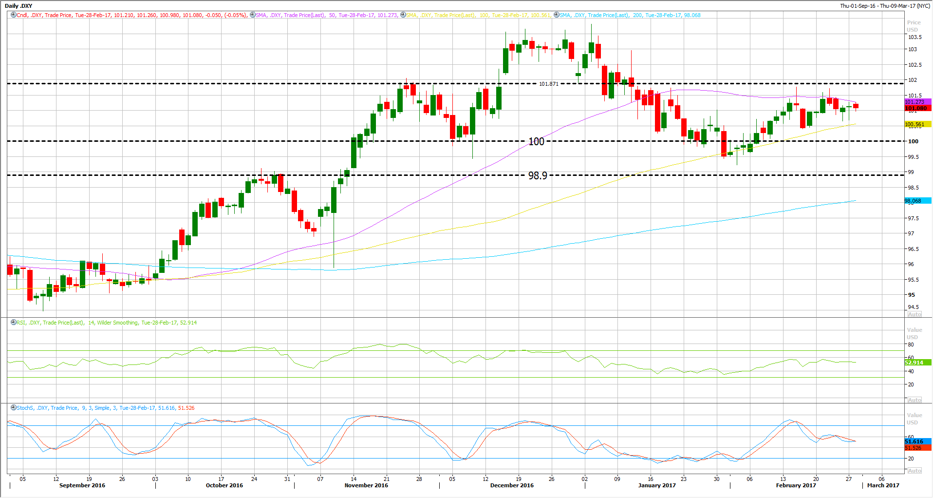 سيناريو آخر وارد لليورو خلال الفترة المقبلة وهو الارتفاع بشكل أكبر وخصوصاً وان المؤشر العام للدولار الامريكي حالياً يتداول في ظل نموذج سلبي على المستوى اليومي وهو نموذج الرأي والكتفين والذي في ما لو استمر بالفعل, فمن المتوقع ان ينخفض مؤشر الدولار الى مستويات 100.50 وحتى مستويات 100.0 المهمة.