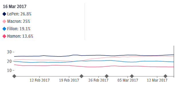 حيث اظهرت استطلاعات الراي الاسبوع الماضي حصول المرشحة المتطرفة لوبان على حوالي 26.8 من الاصوات يتبعها المعتدل ماكرون بحوالي 25% من الاصوات, والمرشح فيلون الذي انخفضت شعبيته نحو 19.1% والاخير هامون الى 13.36%
