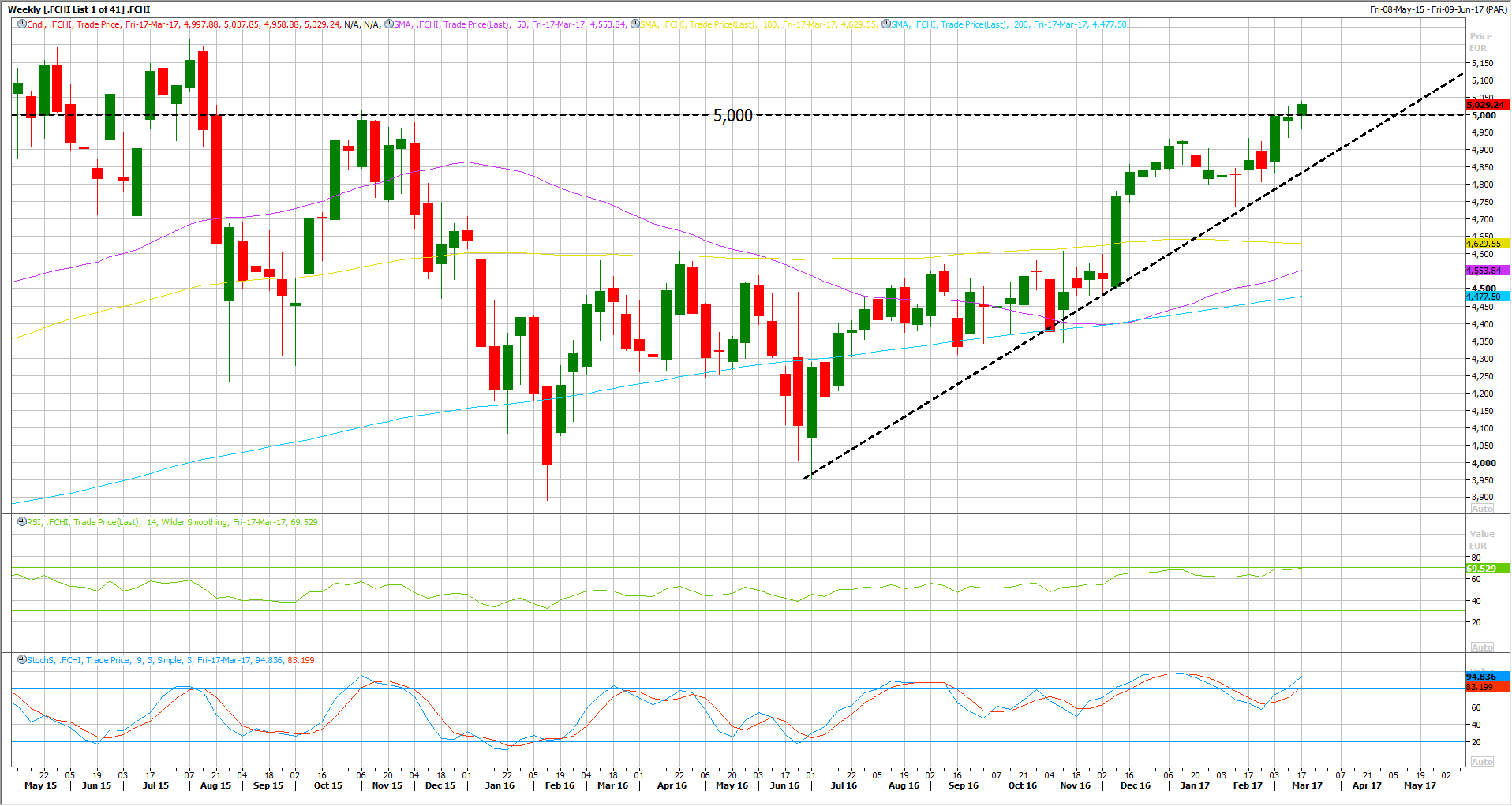 مؤشر cac40 الفرنسي استطاع ان يرتفع خلال الاسبوع الماضي واختراق مستويات المقاومة التي كانت تتمركز عند 5000 نقطة واغلق ايضاً الاسبوع فوقها, وهو اول اغلاق اسبوعي للمؤشر فوق ذلك المستوى منذ نوفمبر من العام 2015.