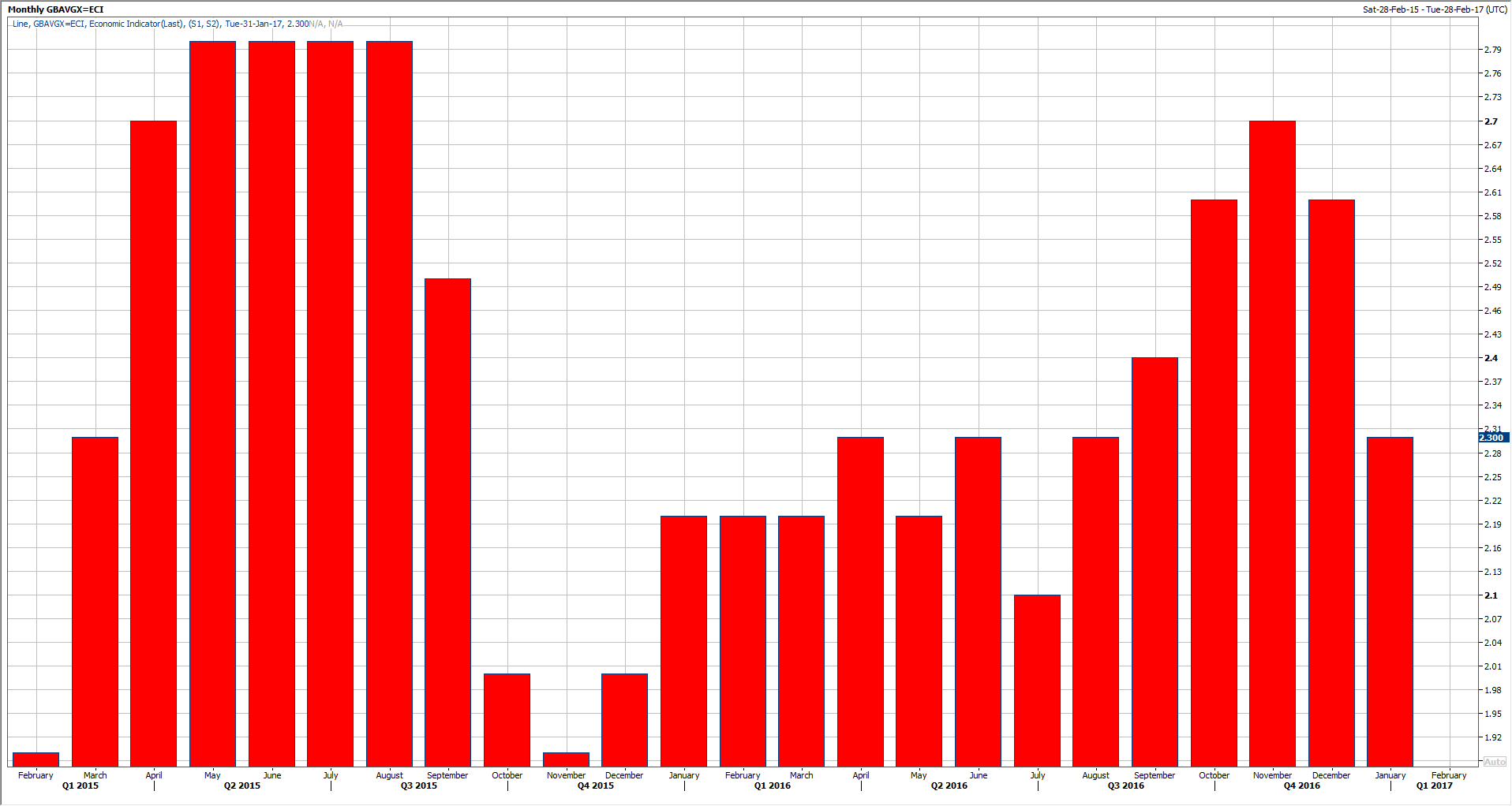 خلال الاشهر القليلة الماضية, اظهرت معدلات الاجور السنوية في المملكة المتحدة تراجعاً واضحاً على عكس توقعات الاسواق وهو قد يكون احد الاشارات الواضحة لعدم تخوف البنك المركزي البريطاني من ارتفاع معدلات التضخم, حيث ان انخفاض الاجور لا يشير الى احتمالات ارتفاع التضخم بشكل كبير جداً في اي وقت قريب.