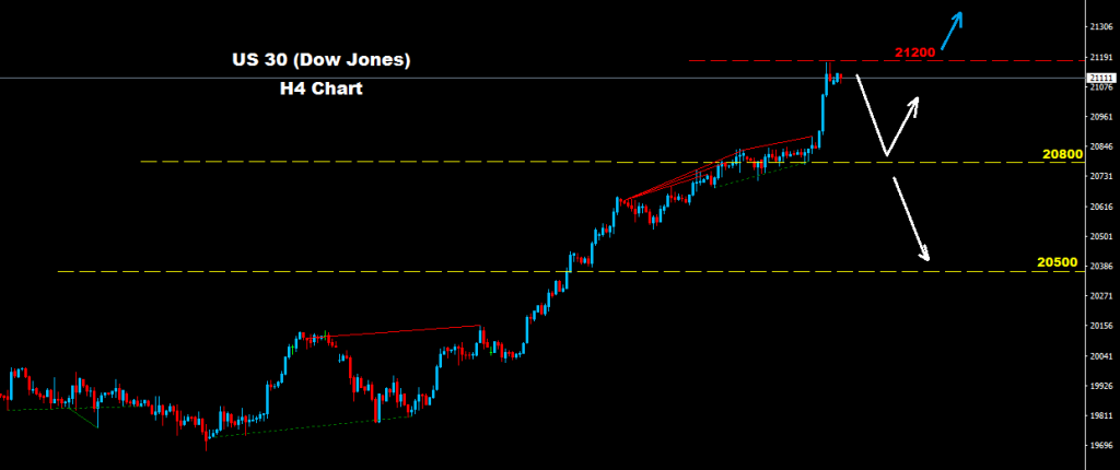 نجح مؤشر الداو الصناعي بالتوجه لمزيد من الارتفاع و بالتوافق مع نظرتنا الفنيه السابقه عليه حيث نجح قبل يومين بضرب اهداف 21000 فيما اقترب من مستويات المقاومة لمناطق 21200