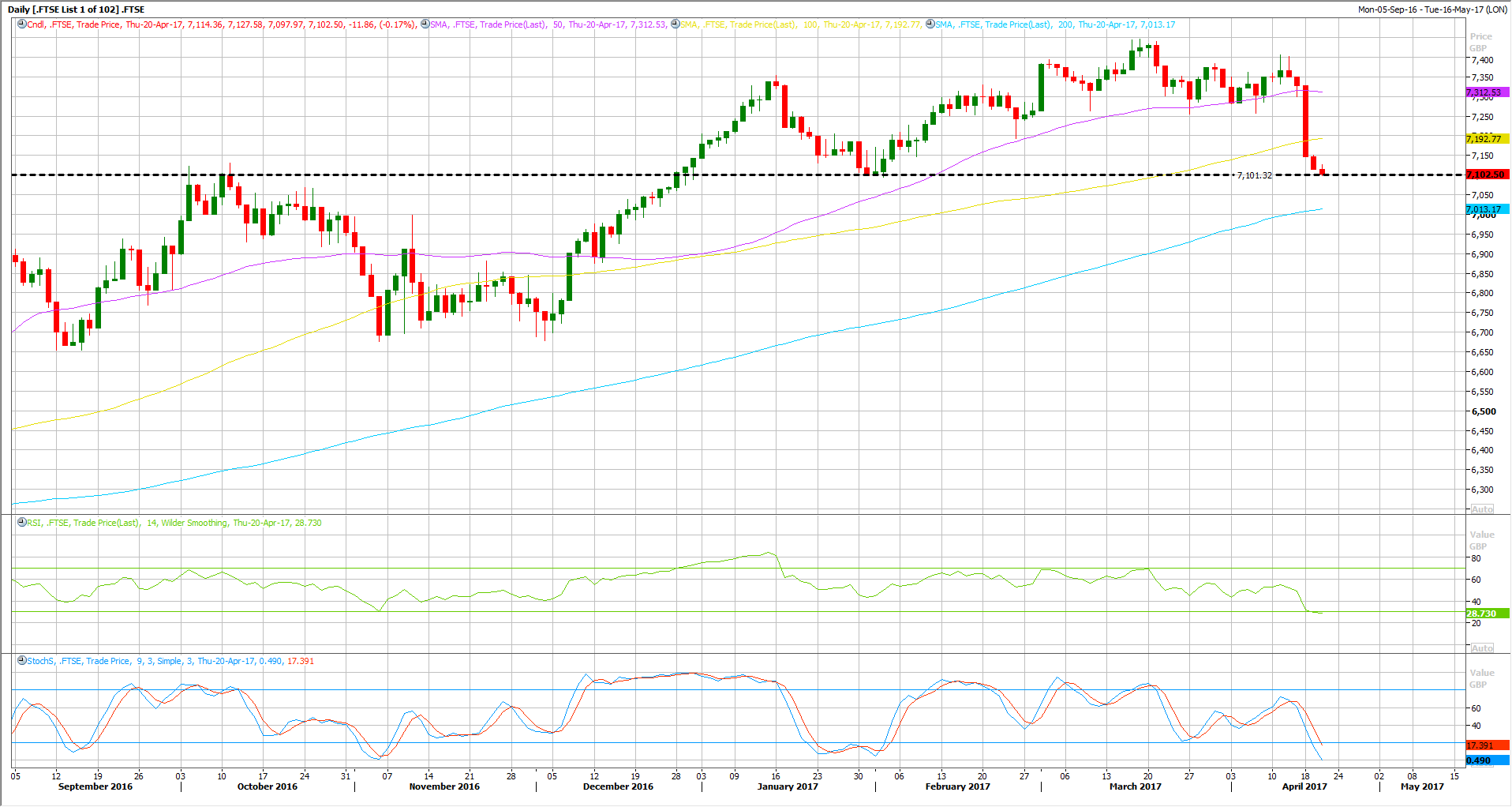 انخفض مؤشر FTSE100 الى ما دون متوسط 50 و متوسط 100 يوم على المستوى اليومي, لينخفض على مدار خمس ايام على التوالي, وهي اطول فترة انخفاض بمر بها المؤشر لم يشهد لها مثيل منذ اكتوبر من العام الماضي.