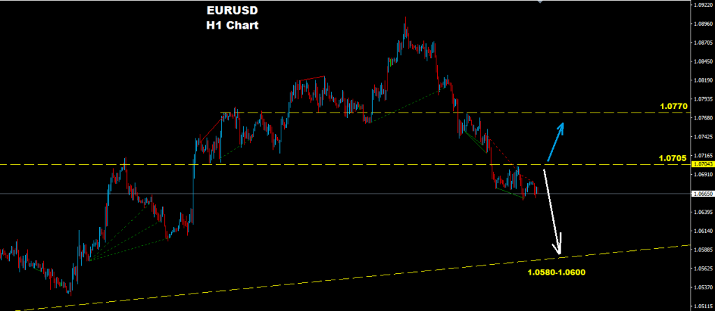 طالما اليورو متماسك تحت مستويات 1.0705 فان مزيد من التراجع و الهبوط لا يزال قائما نحو مستويات 1.0580-1.0600