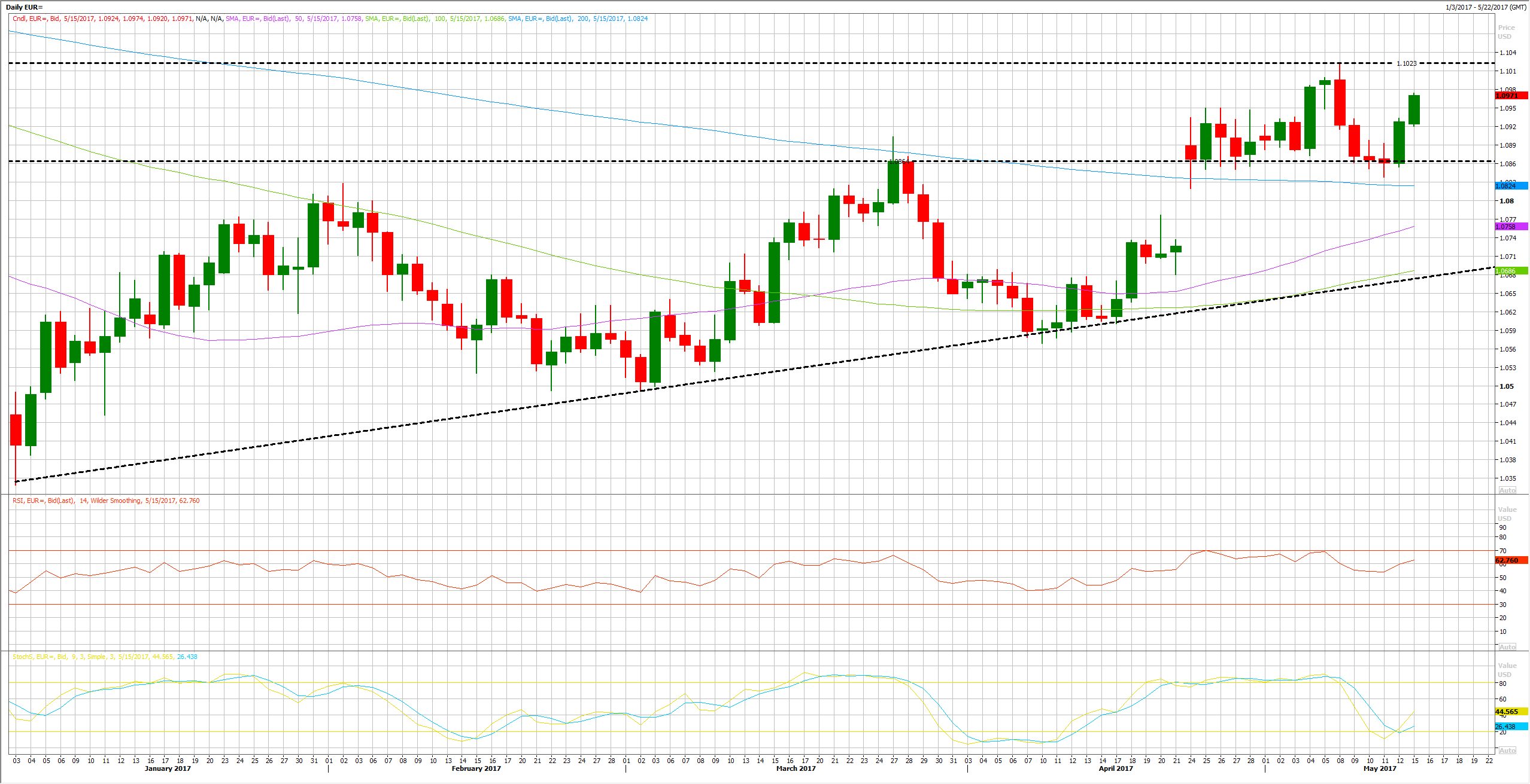منذ نهاية الجورة الاولى للانتخابات الفرنسية وحتى اليوم, استطاع اليورو ان يستقر فوق مستويات الدعم المهمة والتي تتمركز عند 1.0860 لأكثر من 3 اسابيع تقريباً.