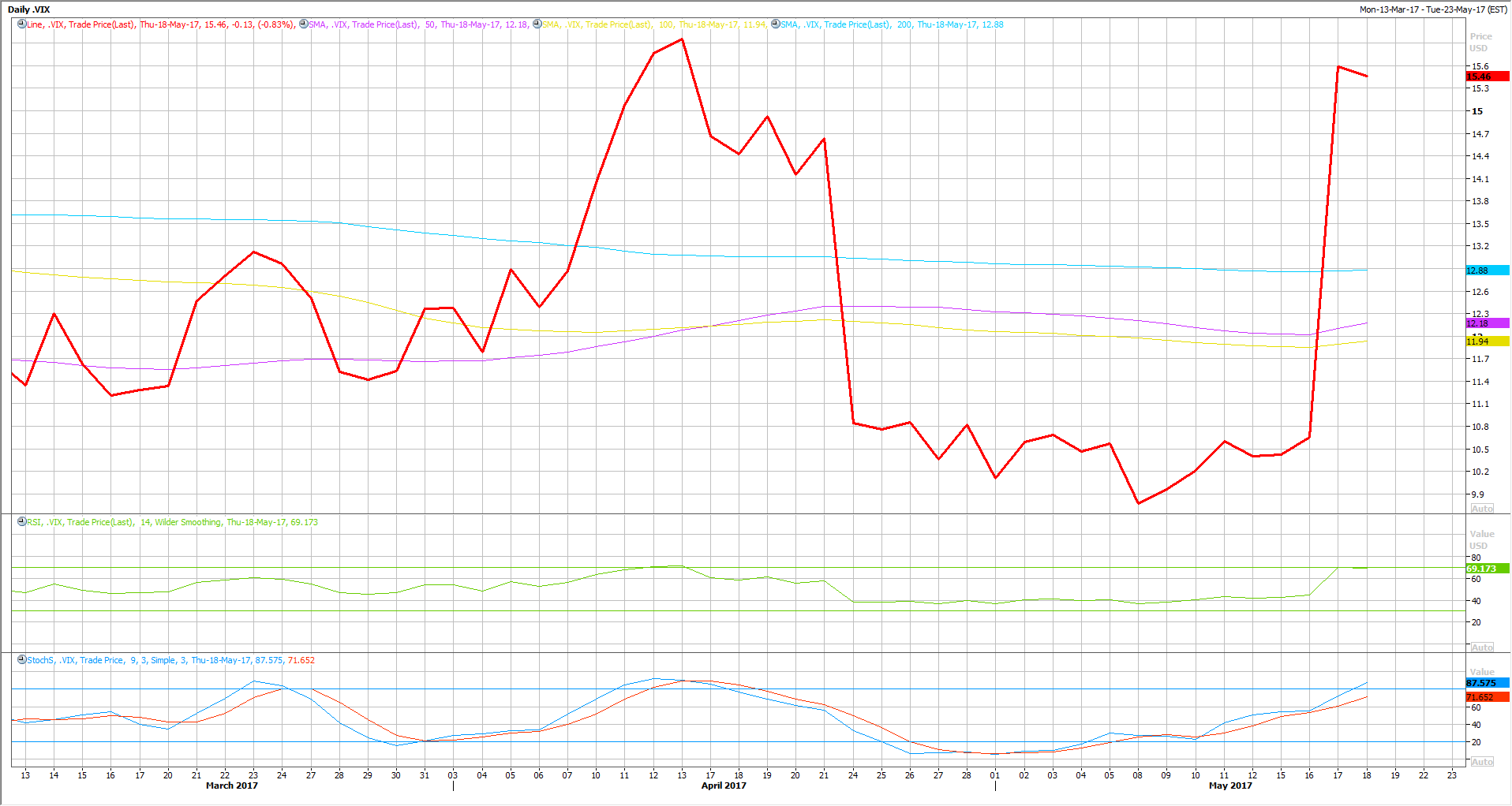 احد اهم الامور التي يجب على المتداولين الانتباه اليه خلال الساعات والايام المقبلة يكمن في مؤشر الخوف VIX والذي ارتفع الى أعلى مستوى له منذ منتصف ابريل الماضي, ليسجل أكبر ارتفاع يومي منذ يونيو من العام الماضي.