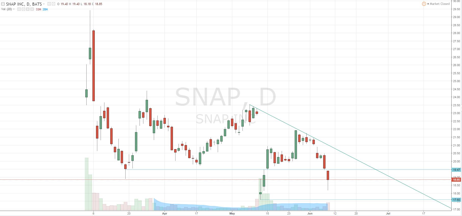 وتعديل النظرة العامة للسهم دائماً ما تؤدي الى انخفاض السهم ما بين نصف دولار الى دولار كامل , بمعنى انه من الممكن ان نشهد انخفاض السهم اليوم الى مستويات 18 او حتى مستويات 17.50 دولار للسهم اليوم وهذه المستويات قد تكون مستهدفة خلال جلسة اليوم. لا استخدم تطبيق سنابتشات لكني افضل التداول على اسهمه.