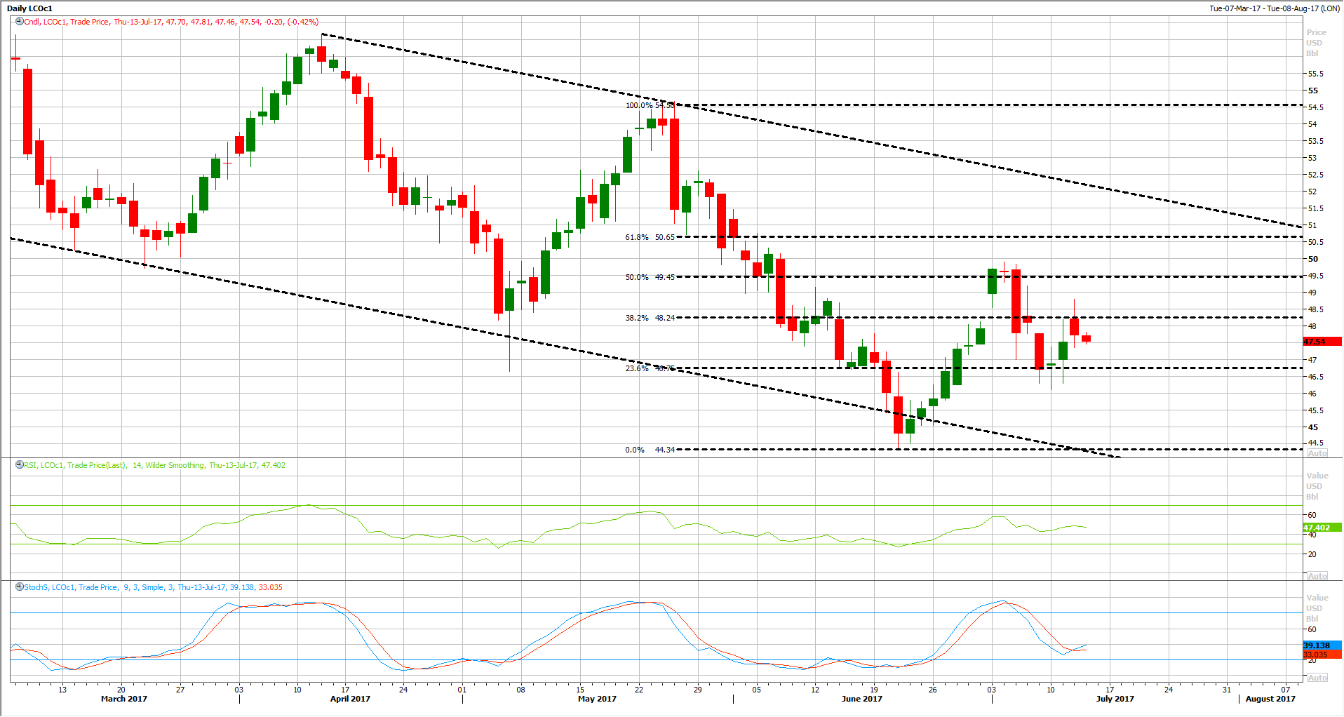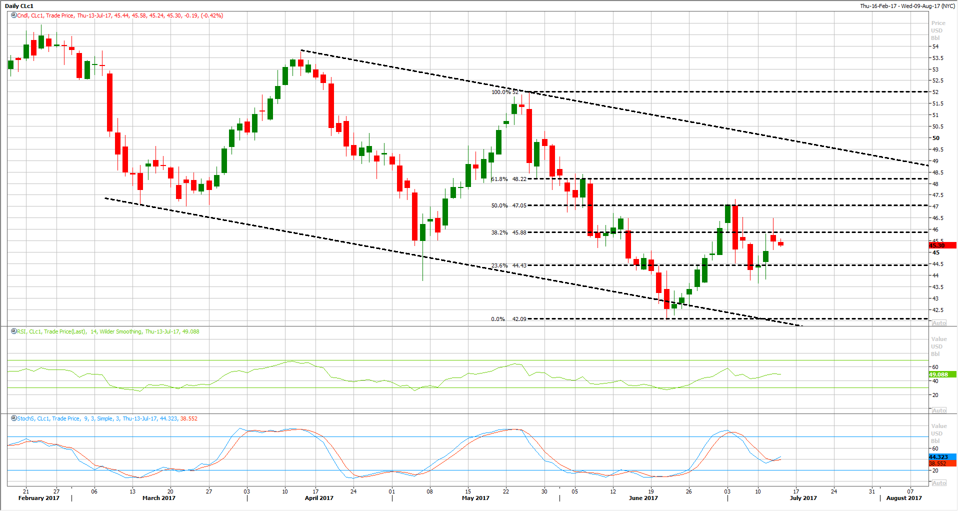 خام برنت تداول خلال الاسابيع الماضية ما بين مستويات 45 دولار و 50 دولار, بينما خام غرب تكساس تداول ما بين مستويات 47 دولار و 42 دولار للبرميل, وذلك على الرغم من وجود العديد من الحوافز الاساسية حول الطلب العالمي على النفط ومخزونات النفط, بالاضافة الى العديد من التصريحات من المنتجين من منظمة اوبك وخارجها وهو ما زاد من حالة عدم اليقين في الاسواق