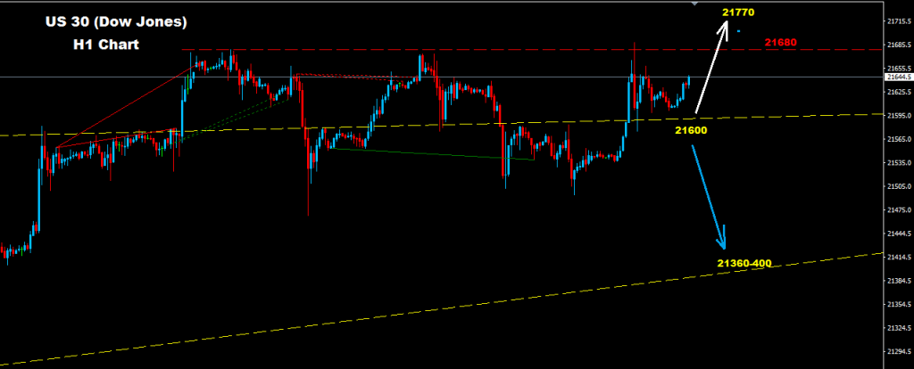 مؤشرات المدى اليومي تظهر قابلية توجه مؤشر الداو نحو مزيد من الارتفاع نحو مناطق 21770 طالما السوق يحافظ على تداولاته فوق مستويات الدعم 21600