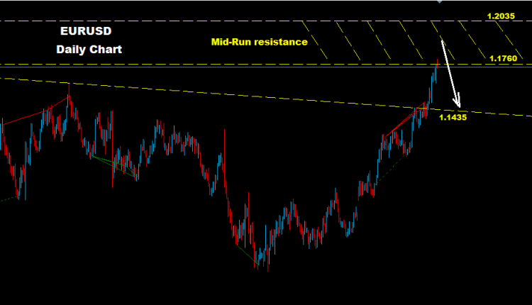 كما نرى على الرسم البياني اطار يومي فان اليورو بدا بالدخول ضمن مناطق المقاومة للمدى المتوسط بين مستويات 1.1760 و 1.2035 , هذه المنطقة قد تدفع بالسوق نحو تراجع تصحيحي نحو مستويات 1.1435 و 1.0820
