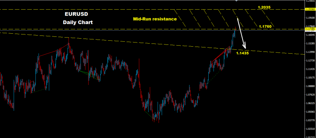 كما نرى على الرسم البياني اطار يومي فان اليورو بدا بالدخول ضمن مناطق المقاومة للمدى المتوسط بين مستويات 1.1760 و 1.2035 , هذه المنطقة قد تدفع بالسوق نحو تراجع تصحيحي نحو مستويات 1.1435 و 1.0820