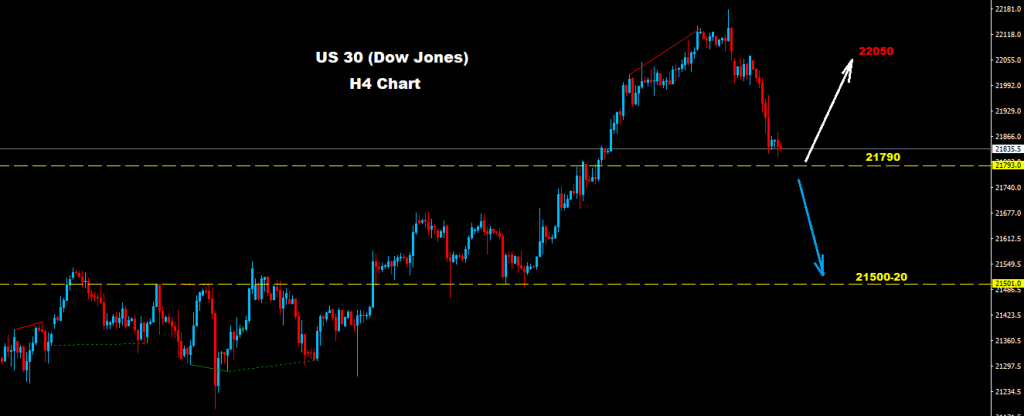 نجح مؤشر الداو بالتراجع تحت مستويات 22000 مما دفع بموجة تراجع و هبوط نحو اهداف 21940 و 21820 كما اشرنا لها سابقا