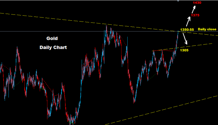 فشل الذهب بتحقيق اغلاق يومي فوق مستويات 1355 مما قد يدفع بموجة تراجع و هبوط كما نرى على الرسم البياني السابق