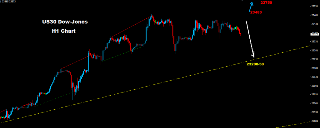 فشل مؤشر الداو باختراق مستويات المقاومة 23480 مما قد يدفع بتراجع تصحيحي على السوق