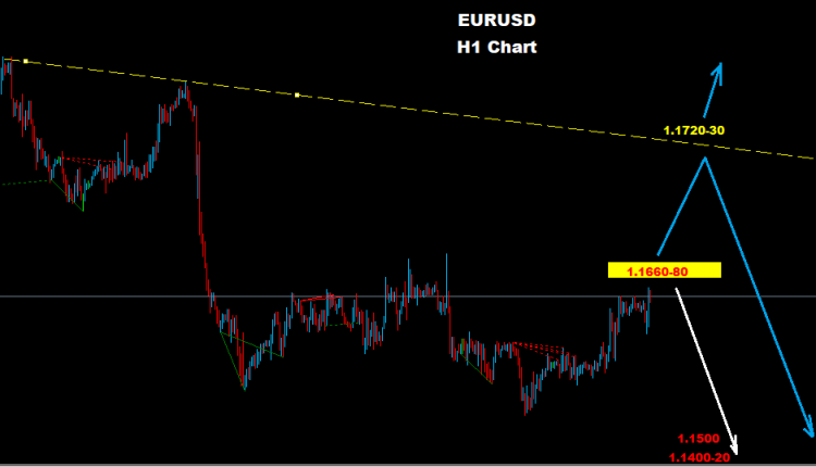 كما نرى على الرسم البياني فاننا سنتوقع موجة تراجع و هبوط جديدة من مستويات 80-1.1660 نحو مناطق 1.1500 و 1.1420