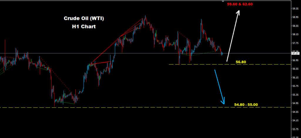 لا يزال النفط الخام يحافظ على تداولاته فوق مستويات الدعم 56.80 حيث لا تزال فرص الموجة الصاعدة قائمة نحو مستويات 59.60