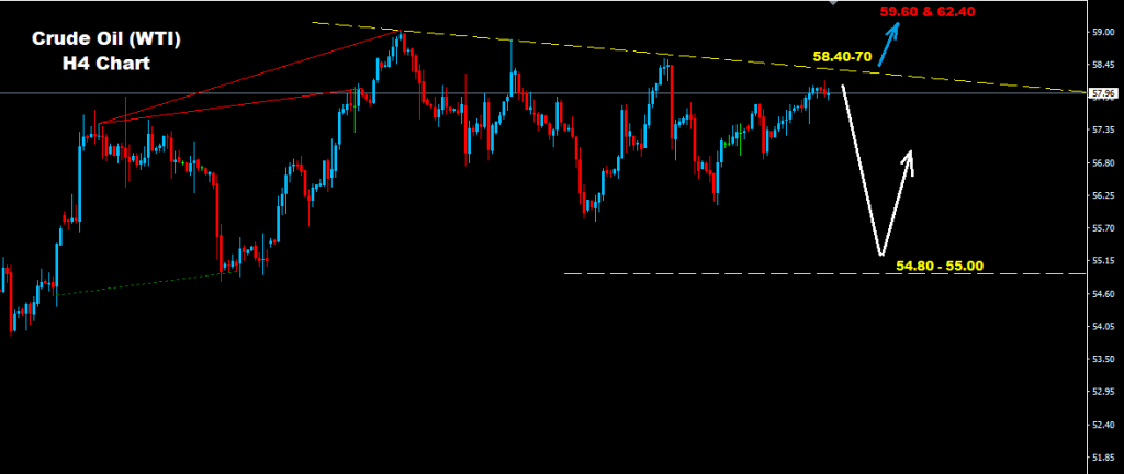 نجح النفط الخام بالحفاظ على منطقة تداول بين مستويات 54.80 و 58.70
