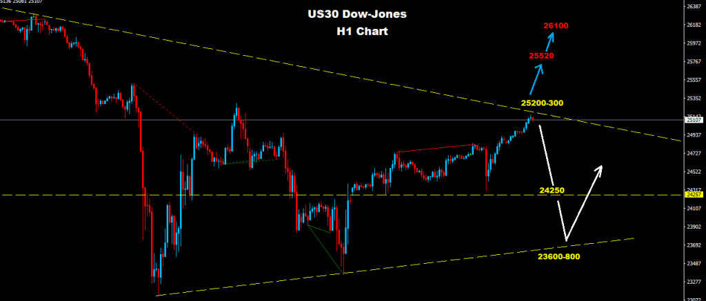 فوق مستويات 25300 فان مزيد من الارتفاع سيكون متوقع نحو مستويات 25520 فيما وفوق هذه المستويات فان موجة ارتفاع اخرى قد تضرب السوق نحو مستويات 26100
