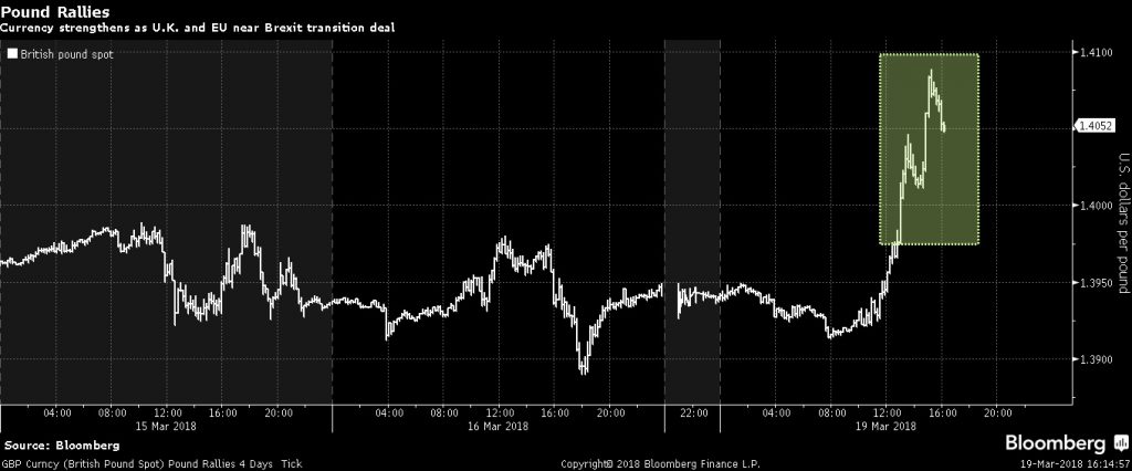 أستفاد الجنيه الإسترليني بشكل إيجابي للإتفاق الإنتقالي بشأن محاداثات البريكست حيث توصلت المملكة المتحدة والاتحاد الأوروبي إلى إتفاق مبدأي بشأن إتفاقية الإنتقال التي تحرص الشركات على الحصول عليها لفترة ما بعد البريكست مباشرة. فيما رحب قادة الأعمال بالإعلان عن إتفاق مؤقت حول فترة التنفيذ, ومن المقرر أن يجتمع زعماء أوروبيون لحضور قمة في بروكسل ليوقع القادة على الإتفاق في قمة يومي الخميس والجمعة عندما يسعون إلى الموافقة على إتفاق الانتقال ثم يوافقون على الموقف التفاوضي للكتلة الأوروبية للمرحلة القادمة من محادثات الخروج البريكست التي تركز على العلاقات التجارية المستقبلية مع المملكة المتحدة.