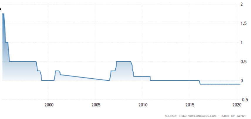 قرر بنك اليابان خلال اجتماعه في أبريل إبقاء معدل الفائدة دون تغيير عند (-0.10٪)، وقام بإزالة قيود على شراء السندات الحكومية بحيث تظل عائدات 10 سنوات عند 0٪.