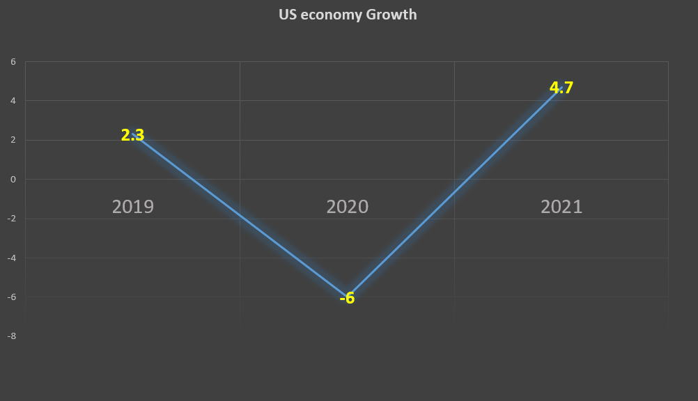 فحسب توقعات صندوق النقد الدولي، من المتوقع أن يسجل الاقتصاد الأمريكي انكماشاً بنحو -6% بحلول منتصف هذا العام مقابل نموه بنسبة +2.3% في 2019 وأن يبدأ الاقتصاد دورة التعافي في منتصف العام الجاري وصولاً إلى +4.7% بحلول منتصف 2021.