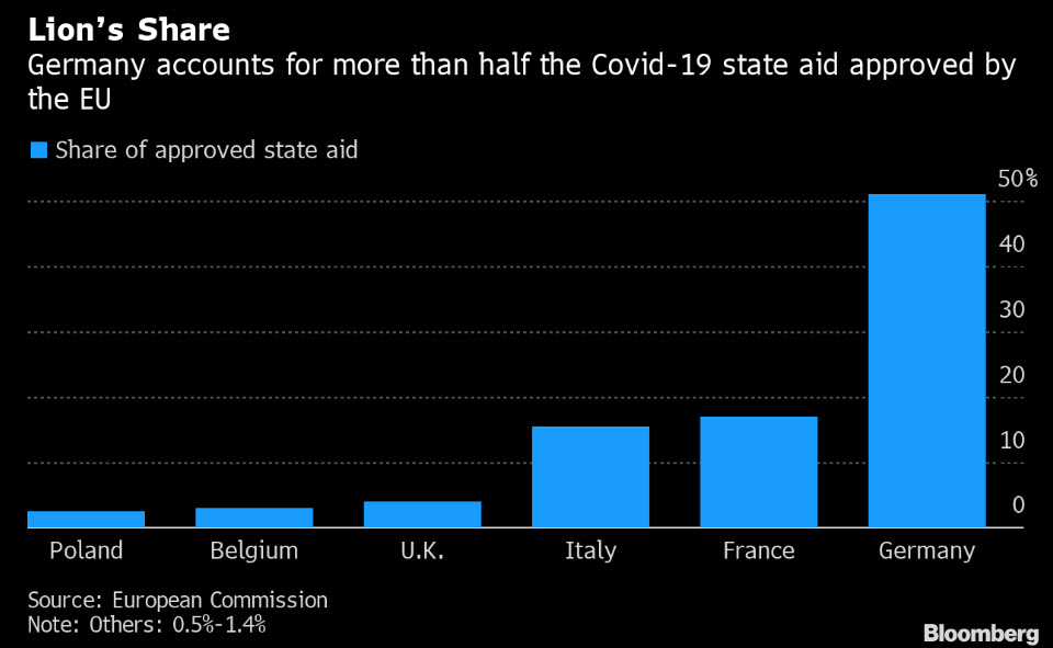 تعتبر تلك المساعدات أقل بكثير من التكلفة المالية الكاملة للوباء، والتي وضعها البنك المركزي الأوروبي بين 1 تريليون و 1.5 تريليون يورو.