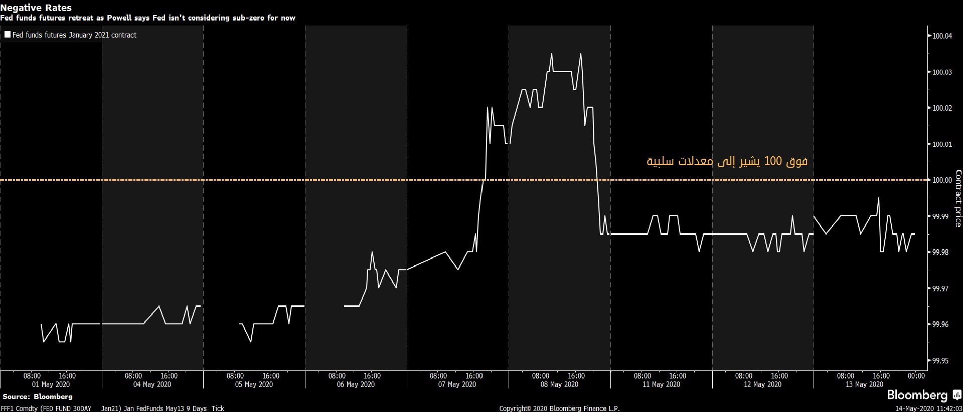 تظهر المعدلات الضمنية على العقود الآجلة للصناديق الفيدرالية انخفاض معيار السياسة للبنك الفيدرالي إلى ما دون الصفر بحلول الربع الثاني من عام 2021. ولم يتغير كثيراً عما كان عليه قبل تعليقات “باول”.