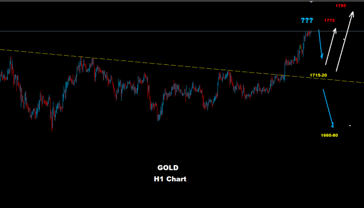 كما نرى على الرسم البياني فإن الموجة الصاعدة لا تزال مستمرة حيث تتوجه الأنظار نحو مستويات 1775 و1795
