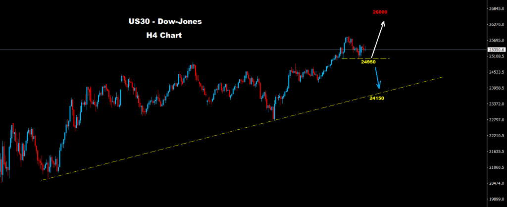 كما نرى على الرسم البياني، لا يزال مؤشر الداو يحافظ على تداولاته فوق مستويات الدعم 24950 حيث إن بقاء السوق فوق هذه المستويات سيدعم مزيد من الارتفاع نحو مناطق 26000