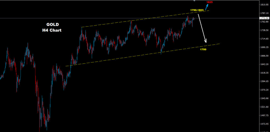 لا زال المعدن الثمين يحافظ على نموذجنا التداولي السابق بالصعود في حين يواجه السوق منطقة مقاومة تبدأ من مناطق 1790 حتى مستويات 1803