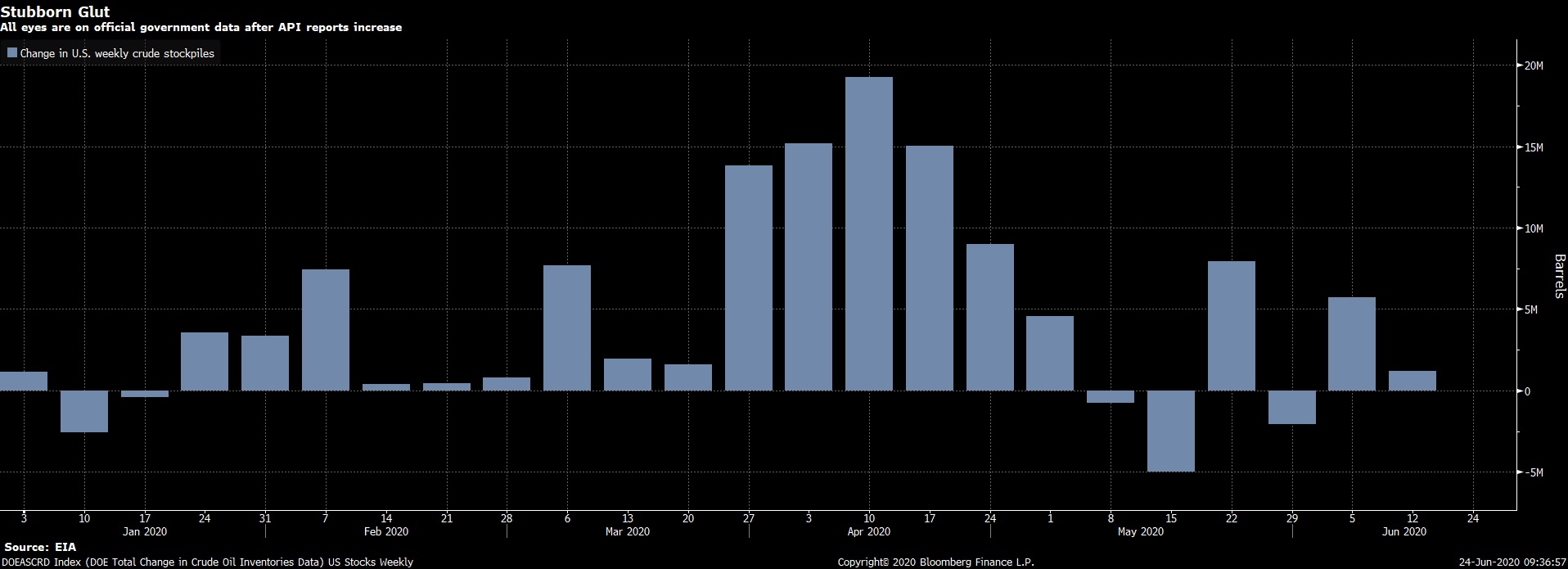 انخفض النفط خلال جلسات اليوم بعد أن أشار تقرير الصناعة إلى زيادة أخرى في مخزونات الخام الأمريكية. ويعم الغموض آفاق الانتعاش الاقتصادي مع استمرار انتشار الفيروس.