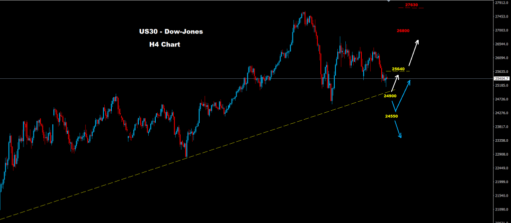 نجح مؤشر الداو بالحفاظ على تداولاته فوق مستويات الدعم للترند الصاعد 24900 بدون اختبار لخطوط الدعم