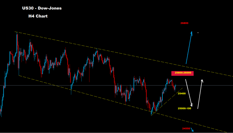 كما نرى على الرسم البياني فإن السوق يواجه منطقة مقاومة ضمن نطاق 26000-25800 حيث إن استمرار السوق بالتداول تحتها سيدعم تراجع تصحيحي نحو مستويات 100-25000