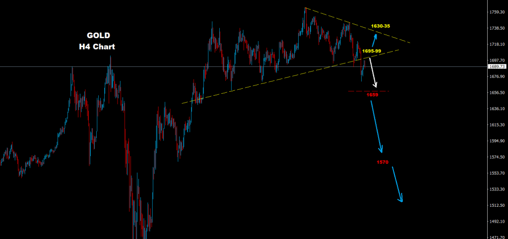 كما نرى على الرسم البياني فإن التوجه الهابط قد يسيطر على السوق طالما الذهب متماسك تحت أولى حواجز المقاومة لمناطق 99-1695 في حين تتواجد مستويات الدعم الرئيسيه على أسعار 1659