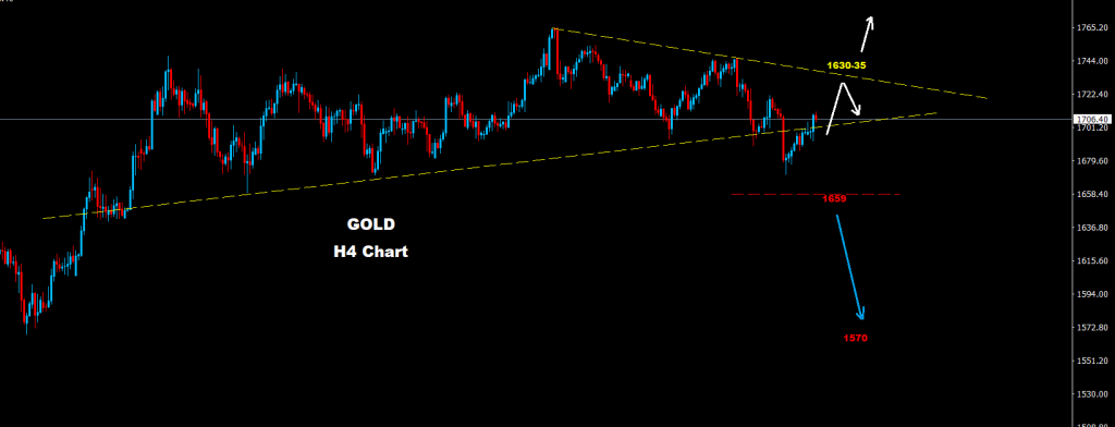 كما نرى على الرسم البياني، وطالما السوق متماسك فوق مستويات الدعم الرئيسيه 1659 فإن موجة ارتفاع قد تضرب السوق لاعادة اختبار حواجز مناطق 35-1730 حيث و فوق هذه المستويات فإن الأهداف القديمه باتجاه مناطق 95-1775 ستعود على الساحه.