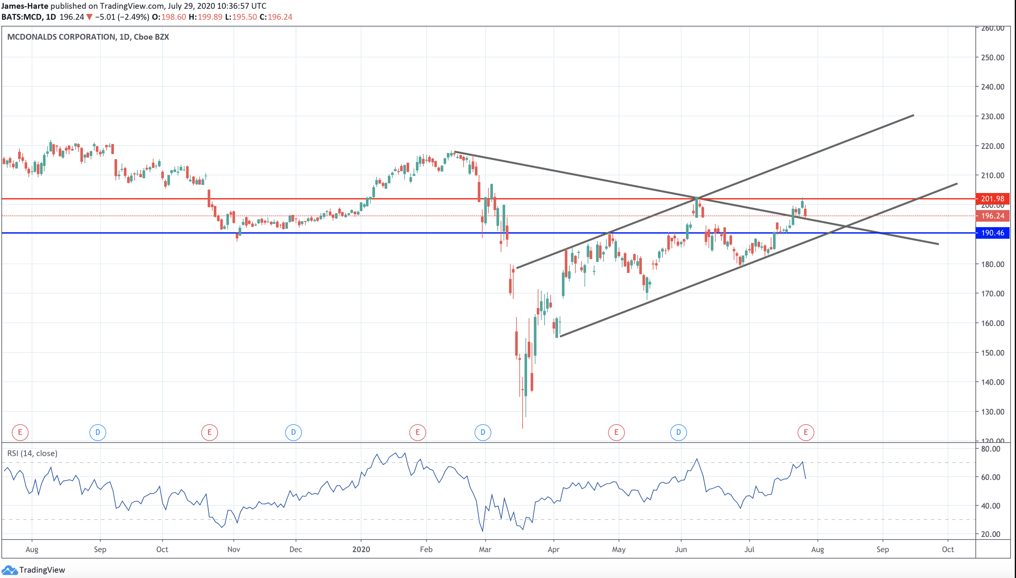 وبغض النظر عن تراجع العائدات، تستمر أسهم ماكدونالدز في التداول داخل القناة الصاعدة طويلة المدى. حيث أن التحيز الإيجابي مدعوم فوق خط الاتجاه الهابط من أعلى مستويات ٢٠٢٠ السابقة. وفي الوقت الحالي، لا تزال المقاومة تحد من ارتفاع السعر عند مستوى ٢٠١.٩٨ حيث شكلت قمة مزدوجة. ولكن، بينما يستقر فوق مستوى الدعم ١٩٠.٤٦ يبقى التركيز منصب على المزيد من الارتفاع في المدى القريب.