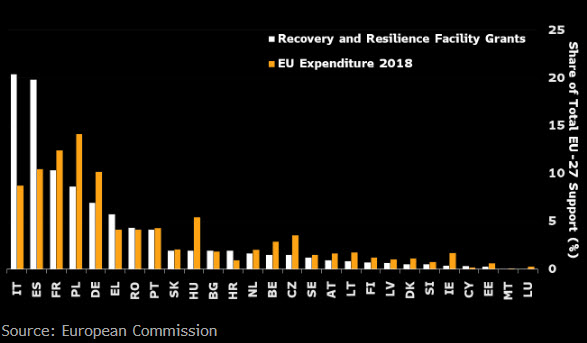 حيث يقدر أن اليونان يمكن أن تحصل على ما يقرب من 12٪ من ناتجها المحلي الإجمالي في منح مقسمة على مدى أربع سنوات، وأسبانيا 6٪ وإيطاليا أكثر من 4٪