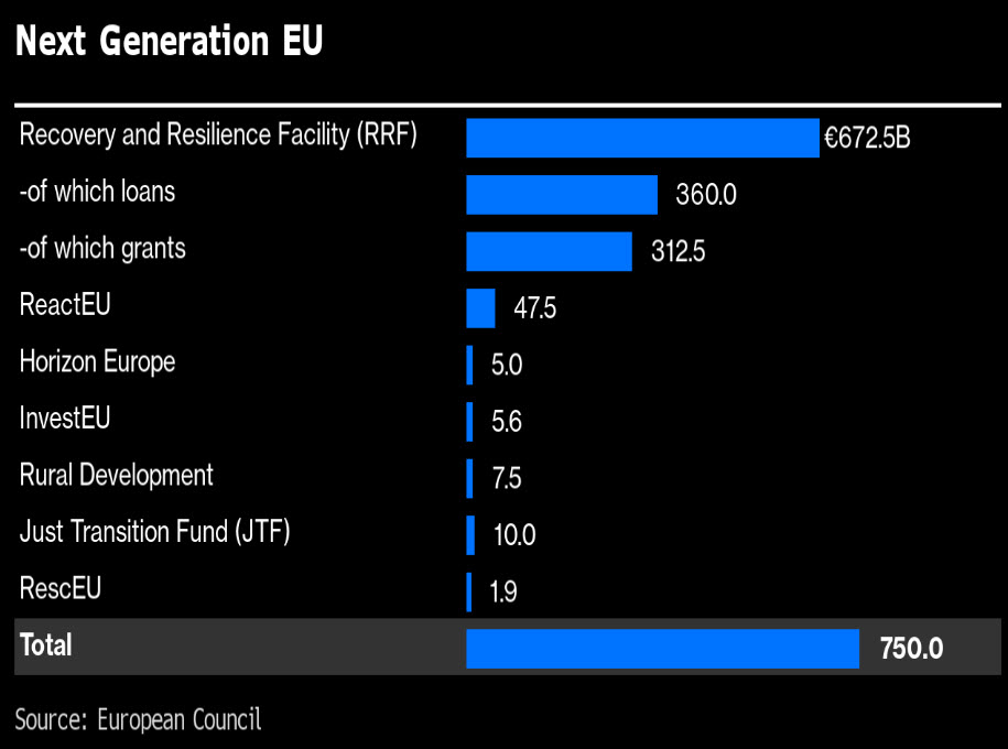 وقد خصصت منها مقدار 750 مليار يورو من الديون المشتركة لمساعدة الدول الأعضاء على تخفيف الانكماش الاقتصادي بسبب جائحة كورونا.